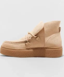 Cradle your feet in warm comfort and cool style with these Amara Winter Boots from Universal Thread™. These ankle boots are fashioned with a tan suede faux-leather upper with paneled construction, stitched detailing, and a lace-up vamp on the distinct broad tongue for an edgy look. The medium-width boots have a classic round toe, a comfortable flocked outsole, and a four-inch platform heel for a striking height lift. Pair them with anything from dresses to jeans and a button-down to complete the look.