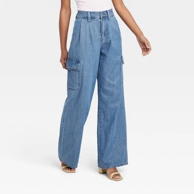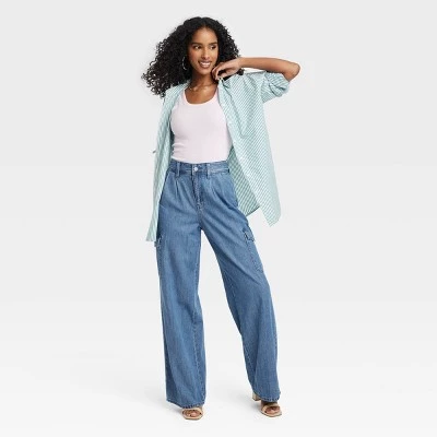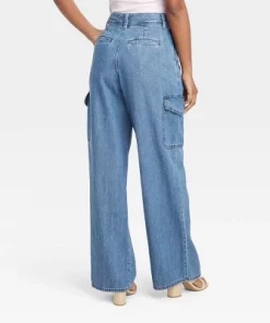 Refresh your casualwear with these Wide-Leg Denim Cargo Trousers from Universal Thread™. The medium-wash denim trousers are made of midweight cotton-rich fabric with a relaxed fit and full length with wide legs for comfortable all-day wear. They’re tailored in a high-rise silhouette with a belt-loop waistband featuring a fly zipper and button fastening for a flattering look and secure fit. The distinct cargo pockets on the legs plus side and back pockets complete the design with functional flair.
